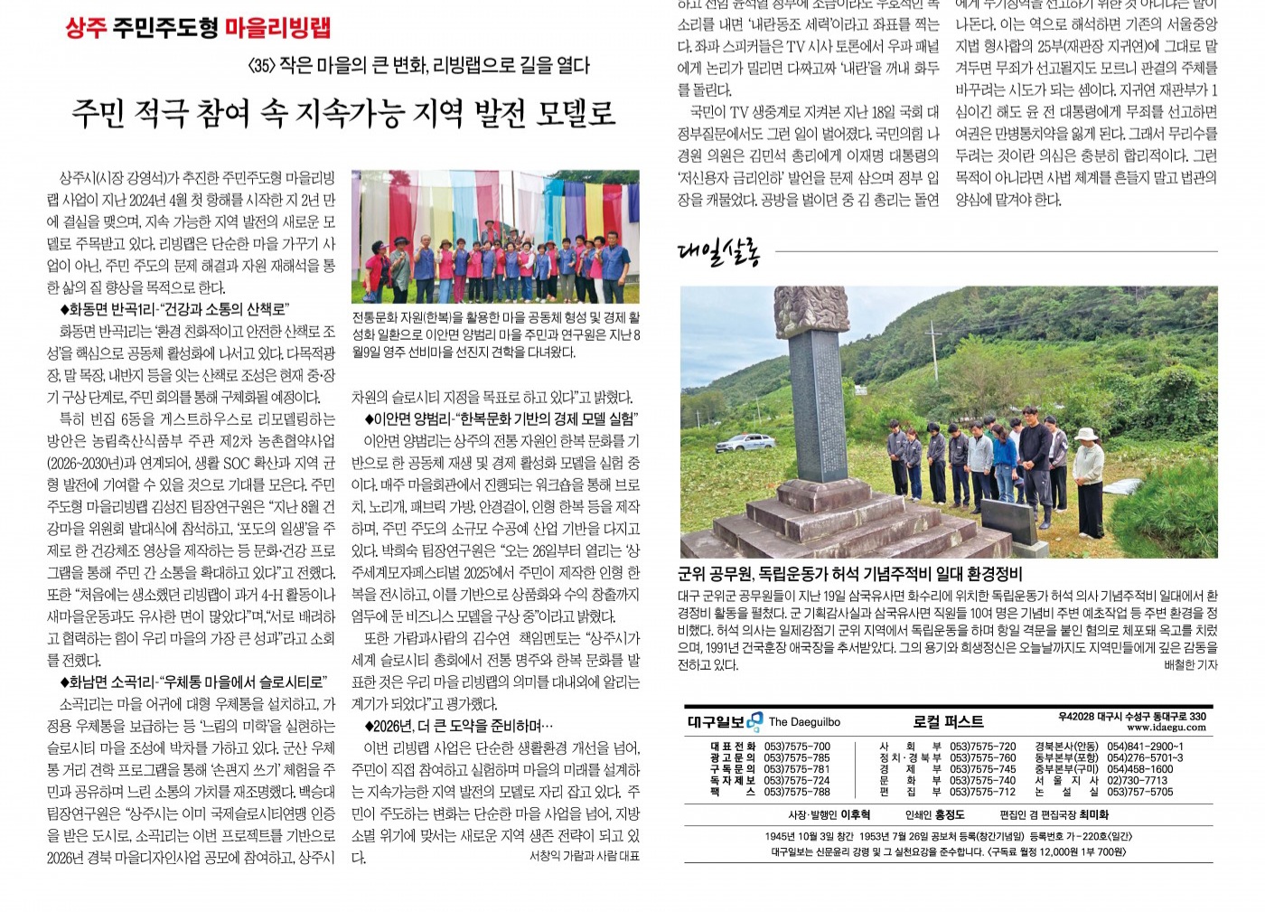 이번 리빙랩 사업은 단순한 생활환경 개선을 넘어, 주민이 직접 참여하고 실험하며 마을의 미래를 설계하는 지속가능한 지역 발전의 모델로 자리 잡고 있다. 상주시 관계자는 “작은 아이디어와 꾸준한 실행이 결국 큰 변화를 만든다. 주민 간 갈등을 소통과 화합으로 이끈 경험은 무엇과도 바꿀 수 없는 자산”이라고 강조했다. 이처럼 주민이 주도하는 변화는 단순한 마을 사업을 넘어, 지방 소멸 위기에 맞서는 새로운 지역 생존 전략이 되고 있다.