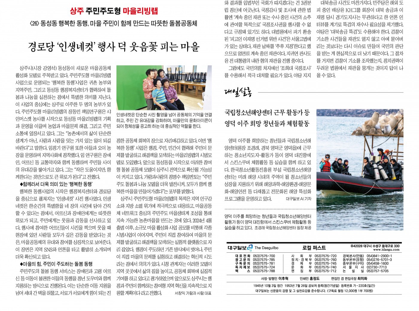 이번 ‘행복한 동행’ 사업은 행정, 주민, 민간이 협력해 주민이 문제를 발굴하고 해결책을 모색하는 마을리빙랩의 시범모델로 도입됐다. 앞으로 동성동을 시작으로 이러한 참여형 돌봄 공동체 모델이 상주시 전역으로 확산될 가능성이 커지고 있다. 가람과사람의 정명수 책임멘토는 “주민주도 돌봄과 나눔 모델을 더욱 발전시켜, 모두가 함께 행복한 마을을 만들어가겠다”는 포부를 밝혔다.