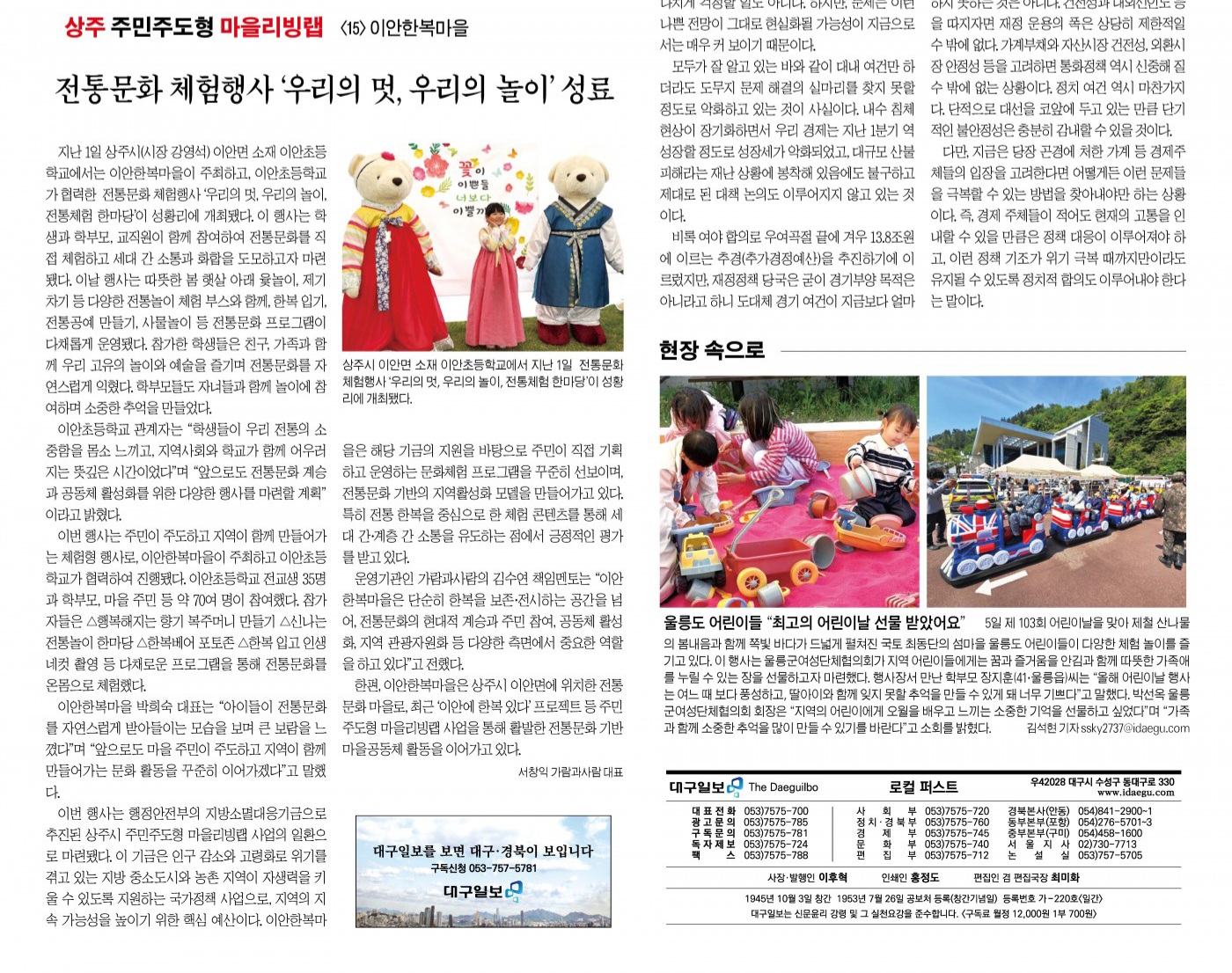 지난 1일 상주시 이안초등학교에서 열린 ‘우리의 멋, 우리의 놀이, 전통체험 한마당’은 마을주민이 주도하고 지역이 함께 만들어가는 체험형 행사다