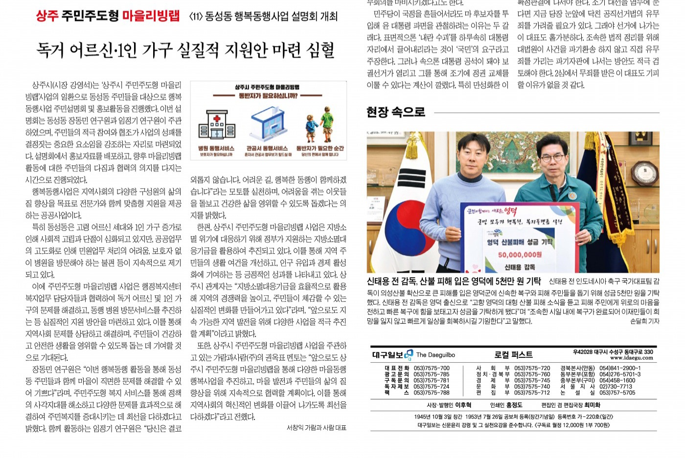 상주시(시장 강영석)는‘상주시 주민주도형 마을리빙랩’사업의 일환으로 동성동 주민들을 대상으로 행복동행사업 주민설명회 및 홍보활동을 진행했다. 이번 설명회는 동성동 장동민 연구원과 임정기 연구원이 주관하였으며, 주민들의 적극 참여와 협조가 사업의 성패를 결정짓는 중요한 요소임을 강조하는 자리로 마련되었다. 설명회에서 홍보자료를 배포하고, 향후 마을리빙랩 활동에 대한 주민들의 다짐과 협력의 의지를 다지는 시간으로 진행되었다.
