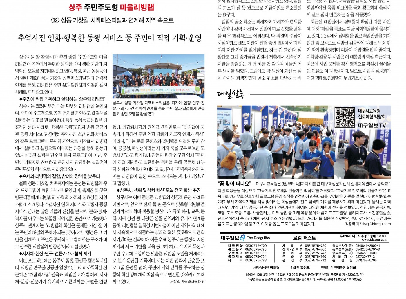 올해 성동 기찻길 치맥축제에는 동성동 리빙랩의 주요 프로그램이 체험 부스로 운영되며, 축제장을 찾은 방문객들에게 리빙랩의 사회적 가치와 실효성을 자연스럽게 소개했다. 스냅사진 인화 서비스와 고령자 동행 서비스 안내는 많은 이들의 관심을 받으며, ‘문화·경제·복지’를 아우르는 복합형 지역 실험 공간으로 기능했다. 상주시 관계자는 “리빙랩의 핵심은 문제를 가장 잘 아는 주민이 해결의 주체가 되는 것”이라며, “행정은 그 기반을 설계하고, 주민은 주체적으로 참여하는 구조가 바로 상주형 리빙랩의 방향성”이라고 설명했다.