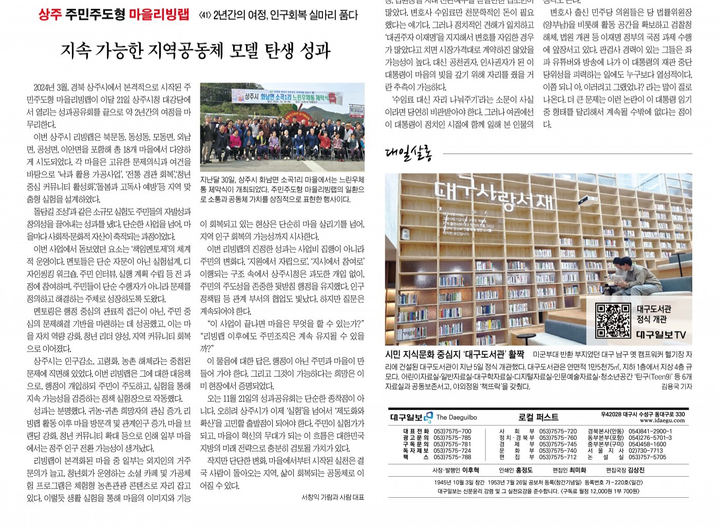 오는 11월 21일의 성과공유회는 단순한 종착점이 아니다. 오히려 상주시가 이제 ‘실험’을 넘어서 ‘제도화와 확산’을 고민할 출발점이 되어야 한다. 주민이 실험가가 되고, 마을이 혁신의 무대가 되는 이 흐름은 대한민국 지방의 미래 전략으로 충분히 검토될 가치가 있다.