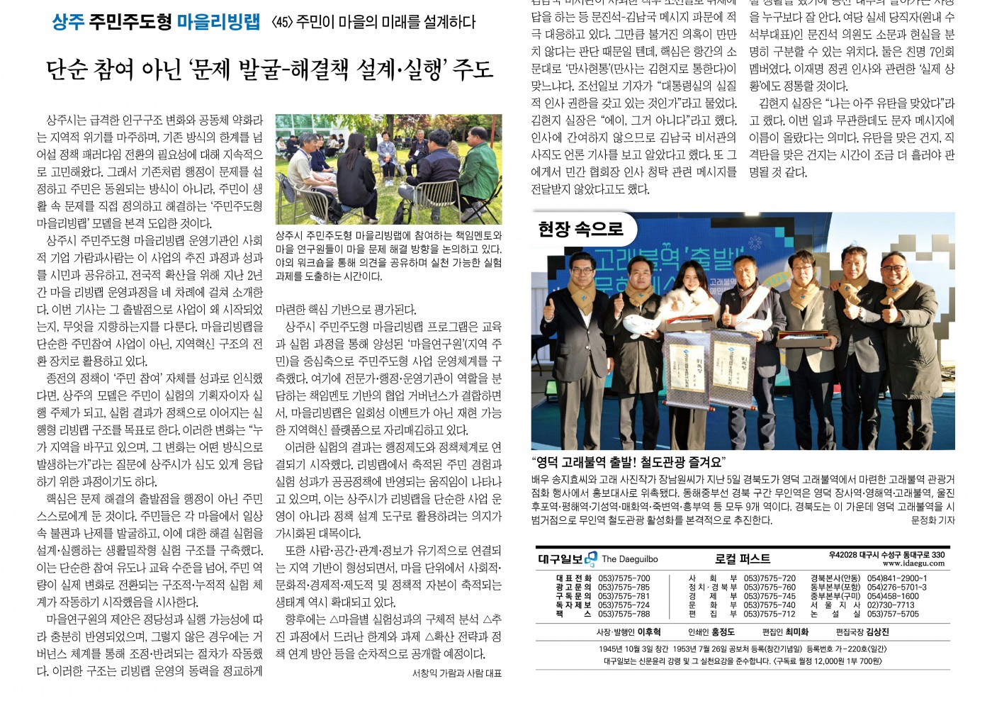 향후에는 ▲마을별 실험성과의 구체적 분석 ▲추진 과정에서 드러난 한계와 과제 ▲확산 전략과 정책 연계 방안 등을 순차적으로 공개할 예정이다. 이번 연재는 상주시가 ‘어떻게 변화하고 있는가’가 아니라, ‘그 변화를 누가 만들고 있으며, 어디로 향하고 있는가’를 기록하는 과정이다.