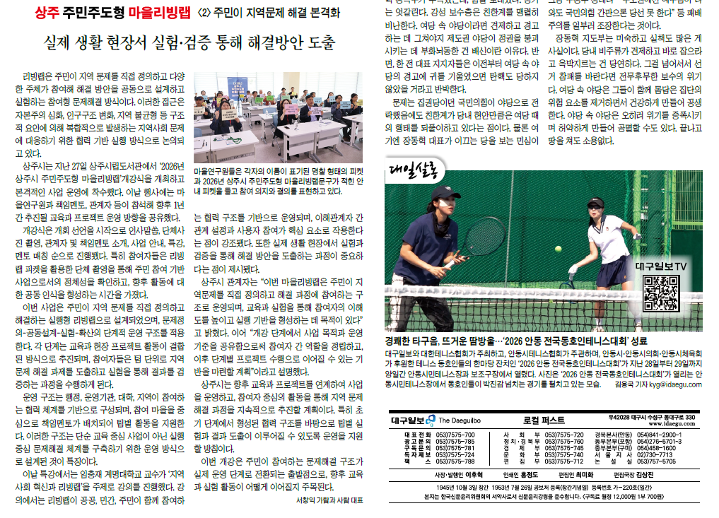 상주시 관계자는 “이번 마을리빙랩은 주민이 지역문제를 직접 정의하고 해결 과정에 참여하는 구조로 운영되며, 교육과 실험을 통해 참여자의 이해도를 높이고 실행 기반을 형성하는 데 목적이 있다”고 밝혔다.