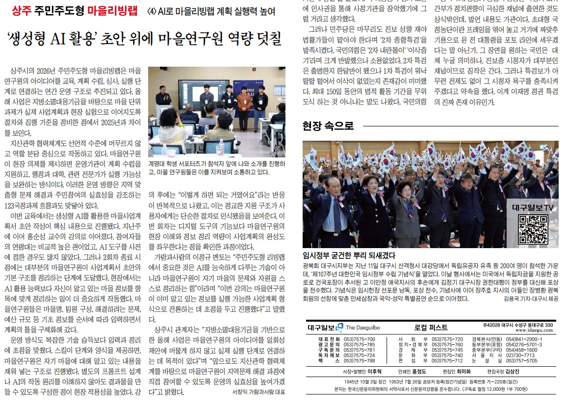 상주시 관계자는 “지방소멸대응기금을 기반으로 한 올해 사업은 마을연구원의 아이디어를 일회성 제안에 머물게 하지 않고 실제 실행 단계로 연결하는 데 목적이 있다”며 “앞으로도 지산관학 협력체계를 바탕으로 마을연구원이 지역문제 해결 과정에 직접 참여할 수 있도록 운영의 실효성을 높여가겠다”고 밝혔다.