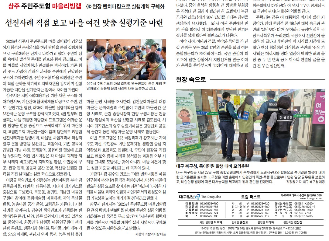 상주시 관계자는 “2026년 주민주도형 마을리빙랩은 현장 탐방과 멘토링을 연계해 주민의 실행 역량을 강화하는 데 중점을 두고 있다”며 “지산관학 협력체계를 기반으로 마을별 계획이 실제 사업으로 구체화될 수 있도록 지원하겠다”고 밝혔다.